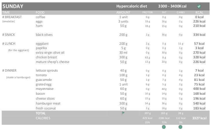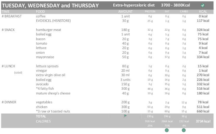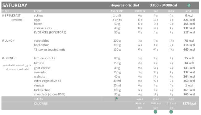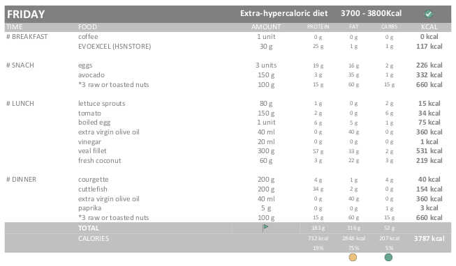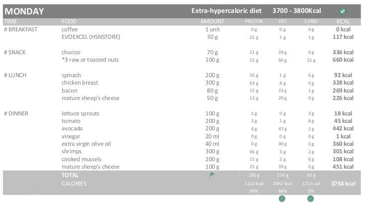 Therefore, I will eat 3300-3400 kcals during the Hypercaloric diet (115%) and 3700-3800 kcals during the EXTRA Hypercaloric diet.