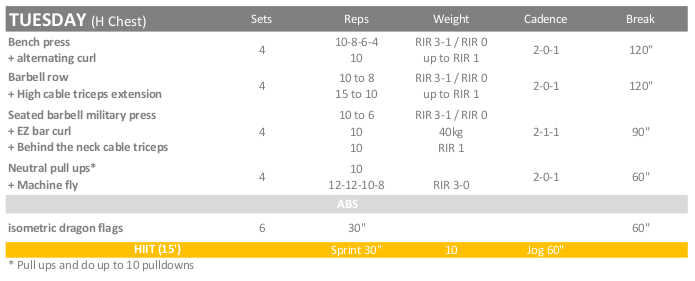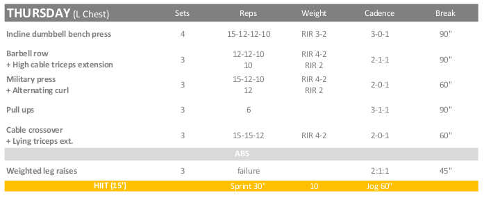 Although I have planned to do a 3 day hybrid routine during the first weeks, I have decided to increase the workout volume. Instead, I am going to follow a medium frequency Chest-Leg routine that you can see now.