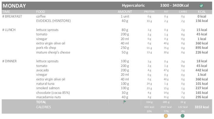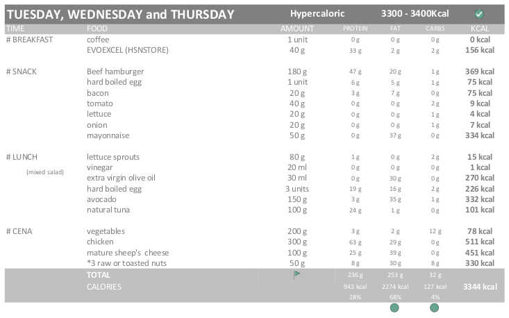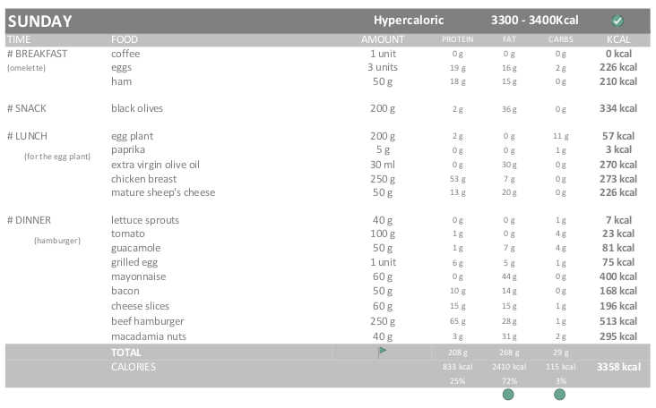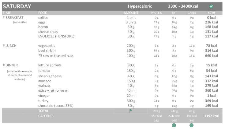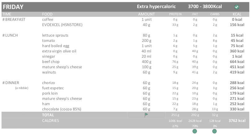 I have gained quite a lot of weight, this morning I weighed 79.3kg (I have gained 800g). Although it is not an excessive gain it has been more than what it should have been. Therefore, to avoid gaining fat, I am going to follow a strictly Hypercaloric diet (115% / 3.300-3.400 kcal). Except for a day of the week (Friday), which will still be EXTRA-Hypercaloric diet (130% / of 3.700 – 3.800 kcal).