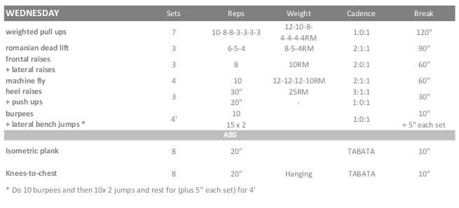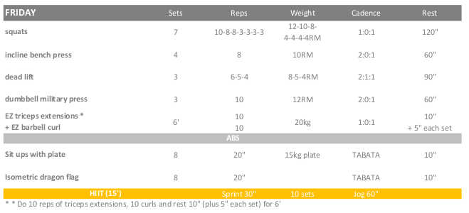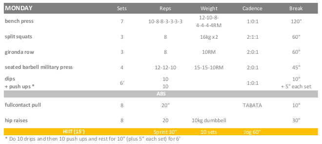 According to plan, let’s continue with a high frequency routine made up of 3 days of Full body (Monday, Wednesday and Saturday). But let’s increase the intensity first with a multi-joint exercise and pushing it to the limit (7 killer sets):