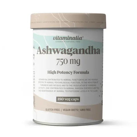Ashwagandha 750mg by Vitaminalia is a dietary supplement in vegetable capsules, made from Withania somnifera root extract, with Vitamin B6 and Zinc.